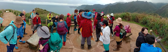 今天要走的黃金七稜指的是南子吝山接至草山主稜的這段稜線,在漁港邊的南新宮集合拍完團體照後,一行28人就順著南子吝步道上行,不多時就抵達展望一級棒的南子吝東峰,可以俯瞰波濤洶湧的北海岸,北至野柳,南到鼻頭角。南子吝山,196公尺,我台灣山岳一覽表的第555顆山頭,卻有著一顆浸在水裡的圖根點,看過雪藏的基點,也有在爛泥裡的、果園裡的、茅草堆裡的、建築裡的、公路旁的、甚至墳堆裡的,泡在水裡的倒是第一次看見。