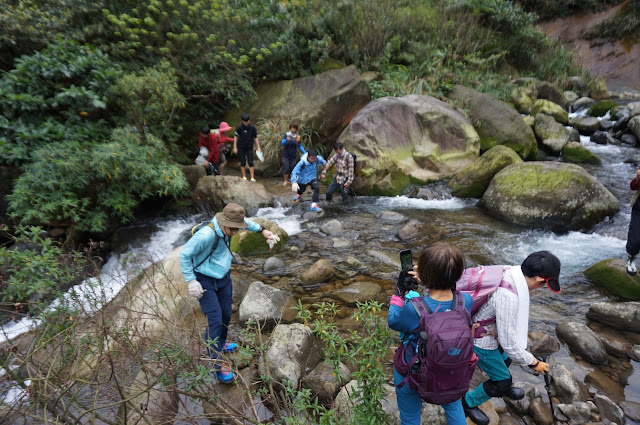 離開南子吝山後,就循稜下降至半屏溪,溪谷前方聳立著保羅尖的陡立山體,而由於前兩日的降雨,溪水水量不小,大夥只得脫鞋過溪,如八仙過海般的各憑本事,田爺不小心在這兒跌了一跤,還好並無大礙。